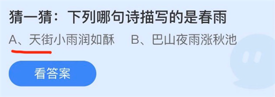 第二道题目涉及古典诗词鉴赏:"猜一猜下列哪句诗描写的是春雨?"正确选项出自韩愈笔下的"天街小雨润如酥",这句传世名作精准捕捉了初春雨水的特质。