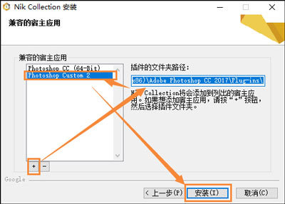 6、重点配置PS插件目录:点击界面左下角的"+"图标,导航至Photoshop安装目录下的Plug-ins文件夹(通常位于C:Program FilesAdobeAdobe Photoshop XXPlug-ins)。选定后列表中将显示"Photoshop Custom"选项,勾选该组件后点击安装按钮。