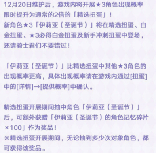 特殊保底机制:当玩家在精选扭蛋中成功获得「伊莉亚(圣诞节)」时,系统将额外赠送100枚专属记忆碎片,这大幅降低了角色升星培养的难度。