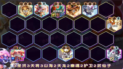 3圣贤羁绊提供关键法力恢复,3天将强化团队生存能力,3山海绘卷提升法术强度加成。2天龙与2幽魂的配合可实现战场分割,2护卫与2武仙子的组合形成攻防兼备的战术体系。