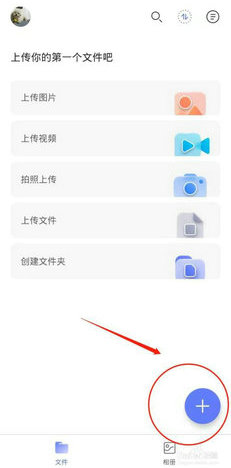 2、定位界面右下角圆形「+」功能键,该按钮采用渐变蓝设计,在深色背景中具有显著视觉提示。点击后弹出操作面板包含「上传文件」「新建文件夹」「扫描文档」等核心功能。
